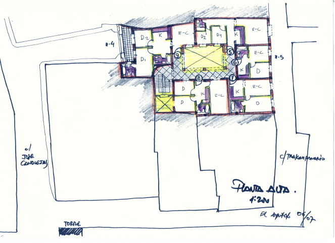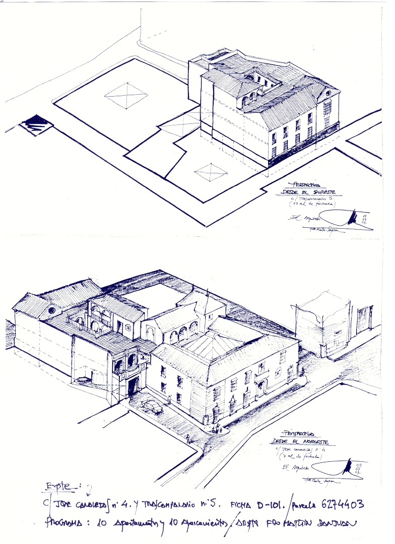 La solución adoptada para dar respuesta al programa demandado por el propietario se materializa mediante un patio central con acceso por la Calle José Canalejas, en torno al cual se distribuyen las viviendas, cuyos accesos se realizan por medio de galerías que dan al patio central. La propuesta consta de una planta bajo rasante y dos plantas más ático sobre rasante, de forma que la planta sótano alberga 11 plazas de aparcamiento, 3 trasteros, el acceso rodado y la comunicación vertical por medio de escaleras, destinándose la planta baja., primera y ático para albergar diez las viviendas y los espacios libres.